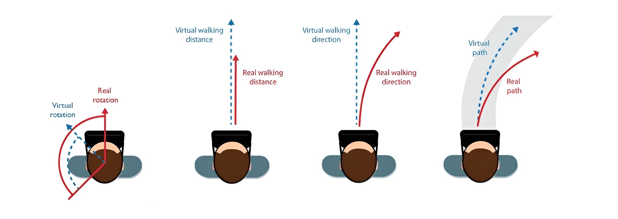 The image below illustrates the different kinds of gains implemented in our AR/VR solution. It showcases how various amplification parameters, such as curvature and movement gain, are applied to simulate the expansion of physical spaces into virtual environments. Each type of gain is visually represented, highlighting the effect it has on user perception and navigation within the virtual world. These gains allow for dynamic adjustments based on user input and environmental factors, ensuring that the virtual experience remains natural and intuitive despite the constraints of physical space.
